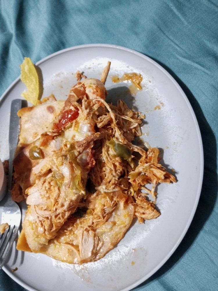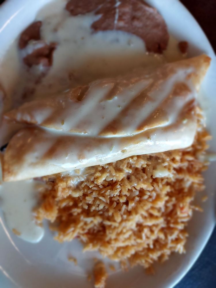 Flour tortilla filled with ground beef or shredded chicken, covered with red sauce. Topped with lettuce, sour cream, shredded cheese and tomato. Served with rice and beans.