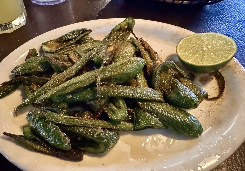 Beef chunks, cooked with mild green sauce. Served with rice and beans.