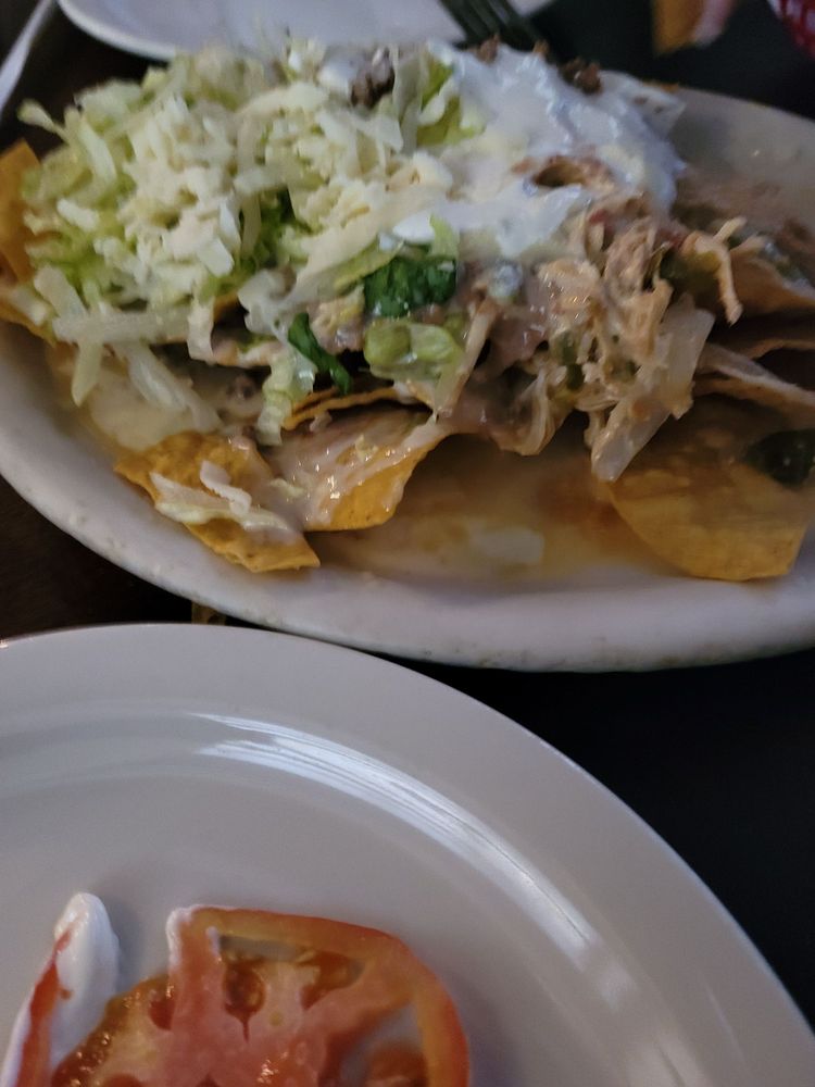 Nachos with ground beef, shredded chicken and beans. Topped with lettuce, tomatoes, sour cream and cheese dip.
